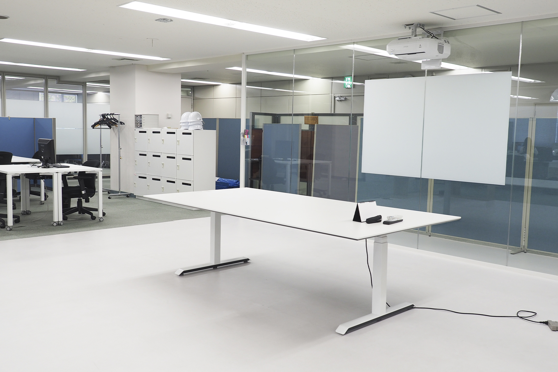 ・全員に 24 inchモニターをデュアル環境で用意 ・全員に鍵付き袖机あり、椅子はひじ掛けあり ・机は150cm幅なのでゆったり