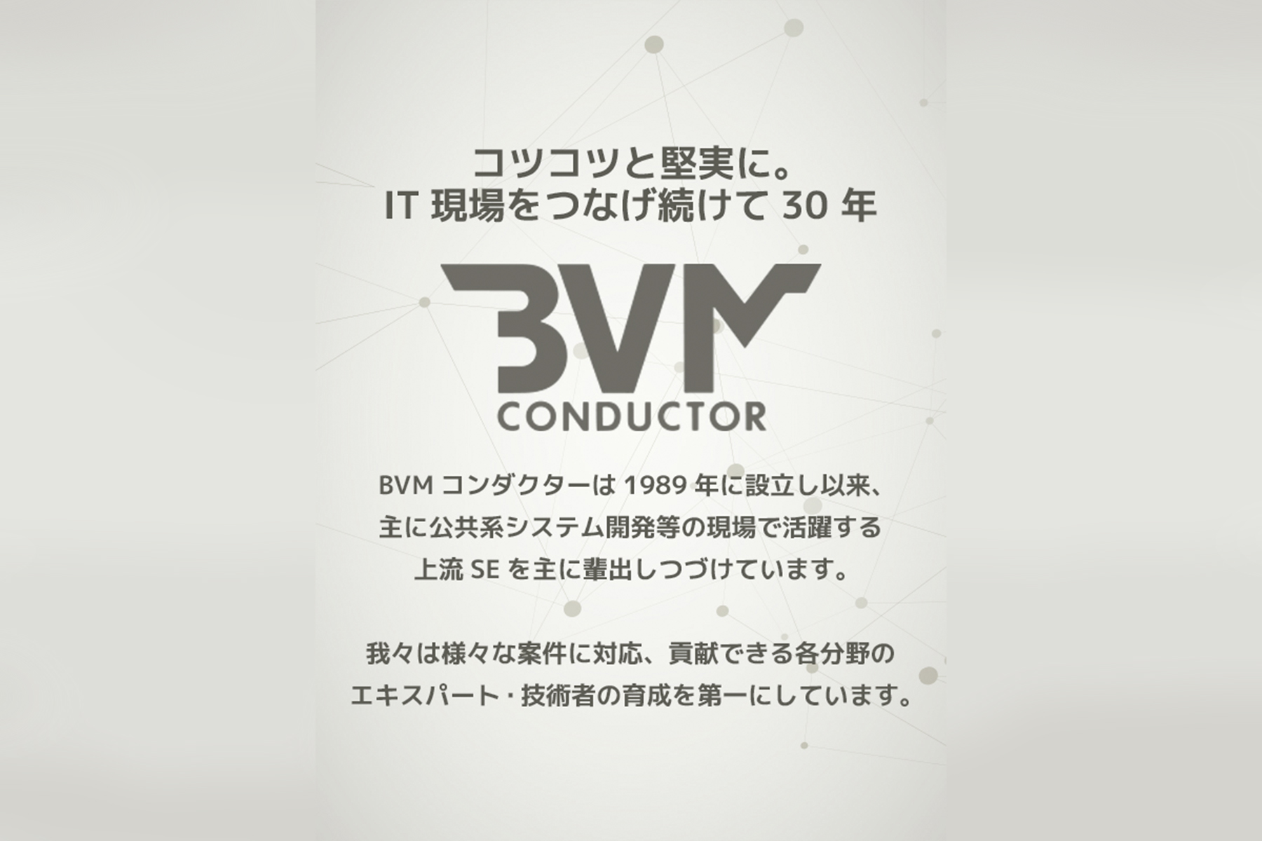当社は設立から35年間、これまで業界最大手SIerとの強力なパイプを強みに、数々のシステム開発プロジェクトの支援を手がけてきました。 直接指名が途切れないのは、当社の強みでもある「細かな着眼点」と、何よりも「より良いものを作り上げたい」という想いを持ったメンバーが集まっていることが背景にあると思っています。 公共系システム開発をメインに携わっていますが、普段の生活の中で当たり前にある身近なサービスは、たくさんの人が関わり、それぞれのこだわりや想いが込められて誕生してきたのだと日々の業務の中でもつくづく実感します。大規模なものを作ろうとすればするほど、さまざまな背景を持った関係者たちとチームを組んで進まなければなりませんが、時にはうまくプロジェクトが進まないことももちろんあると思います。そこで、わたしたちビーブイエムコンダクターの仕事は、ユーザーや社会が求めるものをITで実現できるよう、その過程を自ら描いていくことができると思っています。 どんなAIもITもその根本には人がいます。仕事が人生の大半を占めるのなら、せっかく働くのなら、楽しみつつ、自分の納得のいく仕事をしていただきたいと思っています。そのためにはどんな質問での受け付けますので、聞きにくいことや些細なことでも遠慮なくお尋ねください。それでは、皆様との出会いを楽しみにしています。