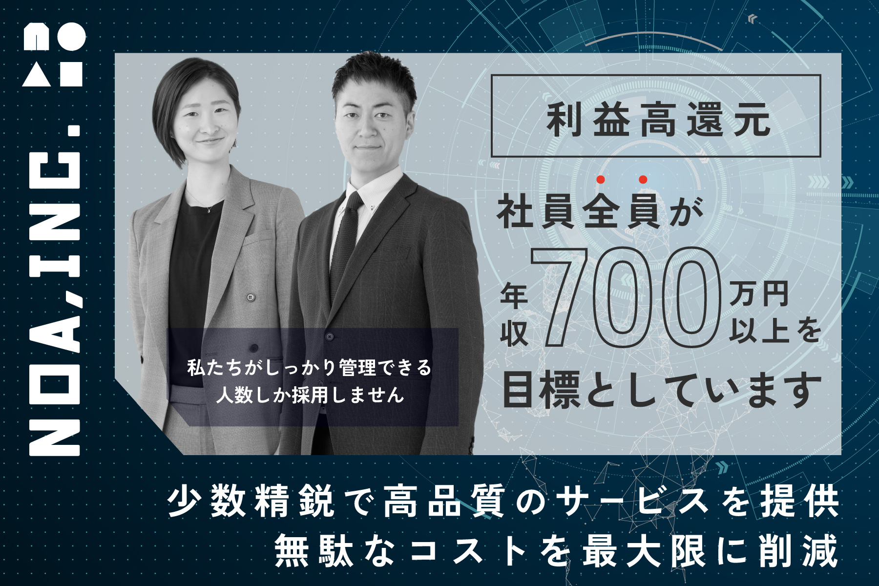 ■配属:SES事業部 ■組織の特徴 〈特徴①:役員の経験について〉 SES事業をメインとした企業で10年以上経験(現場常駐のエンジニアから、営業・採用・マネジメントまで一通り経験)した役員で創業しており、創業して間もないものの、多くの顧客を獲得し、エンジニアがやりたいことを実現するための基盤が整えられています。 〈特徴②:会社の方針について〉 会社を大きくすることが1番ではなく、社員一人一人の幸せを最重要としているため、入社後のギャップが起きないように、採用〜営業〜定期ヒアリングなどは全て役員が行い、役員がしっかりとマネジメントできる範囲でしか社員を増やすつもりはありません。 〈特徴③:少数精鋭のエンジニア集団〉 当社は技術スキルのみで採用はしていません。 高い品質でサービスを提供できる人財を厳選して採用しているため、「人の質」を強みとして顧客から信頼を得ており、「NoAさんの人材が欲しい」と増員情報や新規案件の紹介など、弊社独占でお声を頂くことが多々あります。 高い品質には高い単価が得られ、それが高い給与還元へと繋がるため、他社よりも社員への還元率は高いと自負しています! 〈特徴④:やりたいことにチャレンジできる環境〉 チャレンジ精神を大事にしているため、社員がやりたいと思ったことをやれるように支援しています。 すぐに実現できないことでも、長期的な計画を一緒に立てて実現に向けて共に歩みます。 〈特徴⑤:案件変更について〉 相談しながら案件を決めたものの、案件に参画してみたらイメージと違ったと感じることや、何かしらの理由で心身が辛いと感じ、案件の変更を希望する場合は、速やかに営業調整し、別の案件に変更します。 無理に頑張り続けることが美学だと考えていないので、社員の意志を尊重します。 〈特徴⑥:社内交流について〉 「家族のような温かい会社」にするため、社内交流を大切にしています。 新年会などの飲み会の他、数ヶ月に1度現場の業務を調整して社内打ち合わせやランチをする機会を設けています。 社内イベントの開催日が休日の場合は、特別有給休暇を付与することもあります。 〈特徴⑦:組織形態について〉 当社は役員以外の役職は一切作らないホラクラシー組織です。 全員が対等な立場で意見を出し合い、オモシロイ会社を作りたいと思っています。 新しい福利厚生の検討や自社サービスの検討なども、自身の意見が言いやすく反映されやすいので 会社の成長を共に喜べるかと思います。
