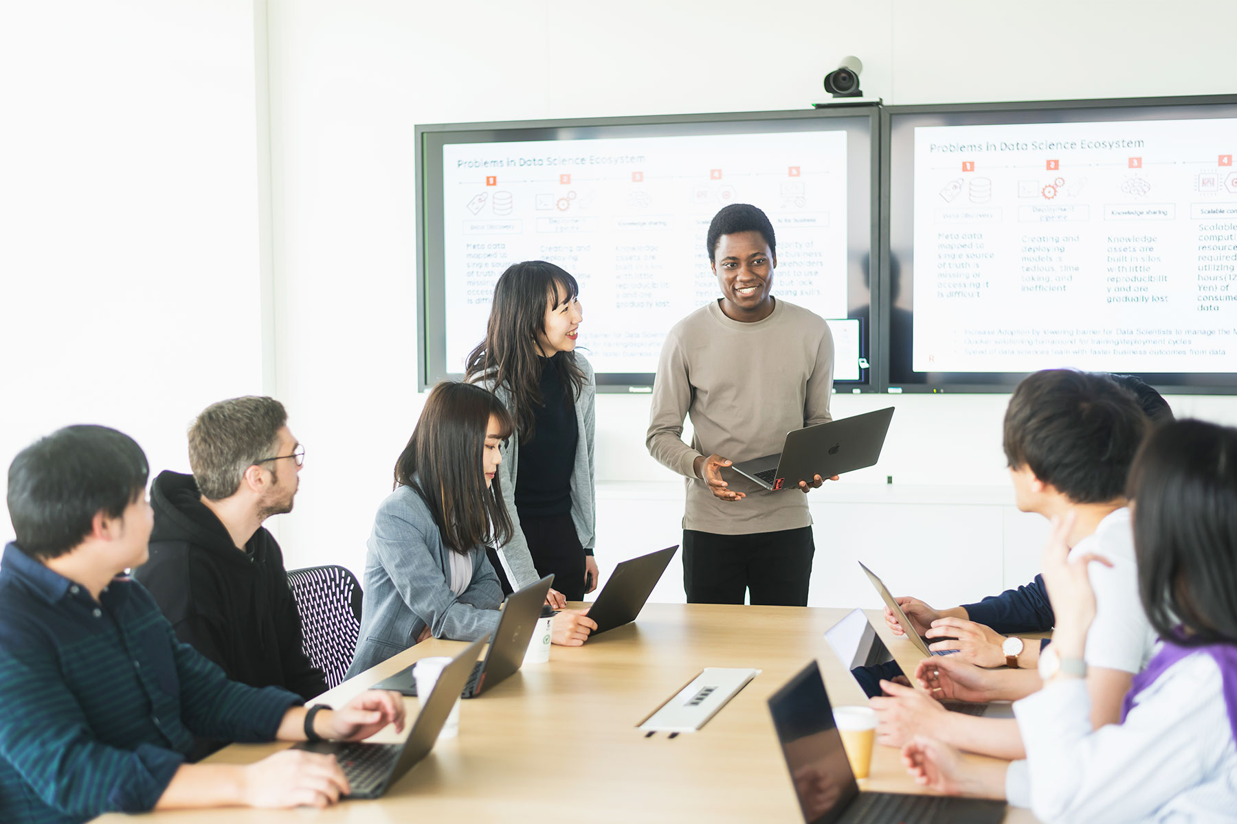 ■ チームの編成について ・チームで開発をしており、メンバーは3~4名です <プロジェクトについて> ・それぞれプロジェクトを立てて進めています ・規模が小さいものであれば、1人でプロジェクトを進めることもあります ■ 開発手法、タスク管理などについて ・プロジェクトの内容に合わせてチーム内で相談して開発手法を選択しています ・朝に15~30分ほど時間をかけて、その日までの進捗状況や困っていることを確認しています ・定例のミーティングは週に1回30分ほど行われていますが、なるべく無駄なミーティングは減らし、個人個人が作業に使える時間を増やしていこうという空気があります ■ 職場環境について ・一部リモート勤務が続いていますが、ZoomやSlack、Viberなどのツールを使って業務を進めています ■ チームの雰囲気について ・こういう方法でやりたいと伝えれば、すぐにリーダーが検討してくれる関係性がチーム全体に浸透しています ・自主的な動きを尊重してくれる文化です ・外国籍の社員も多いため、コミュニケーションがオープンで、インターナショナルな雰囲気があります