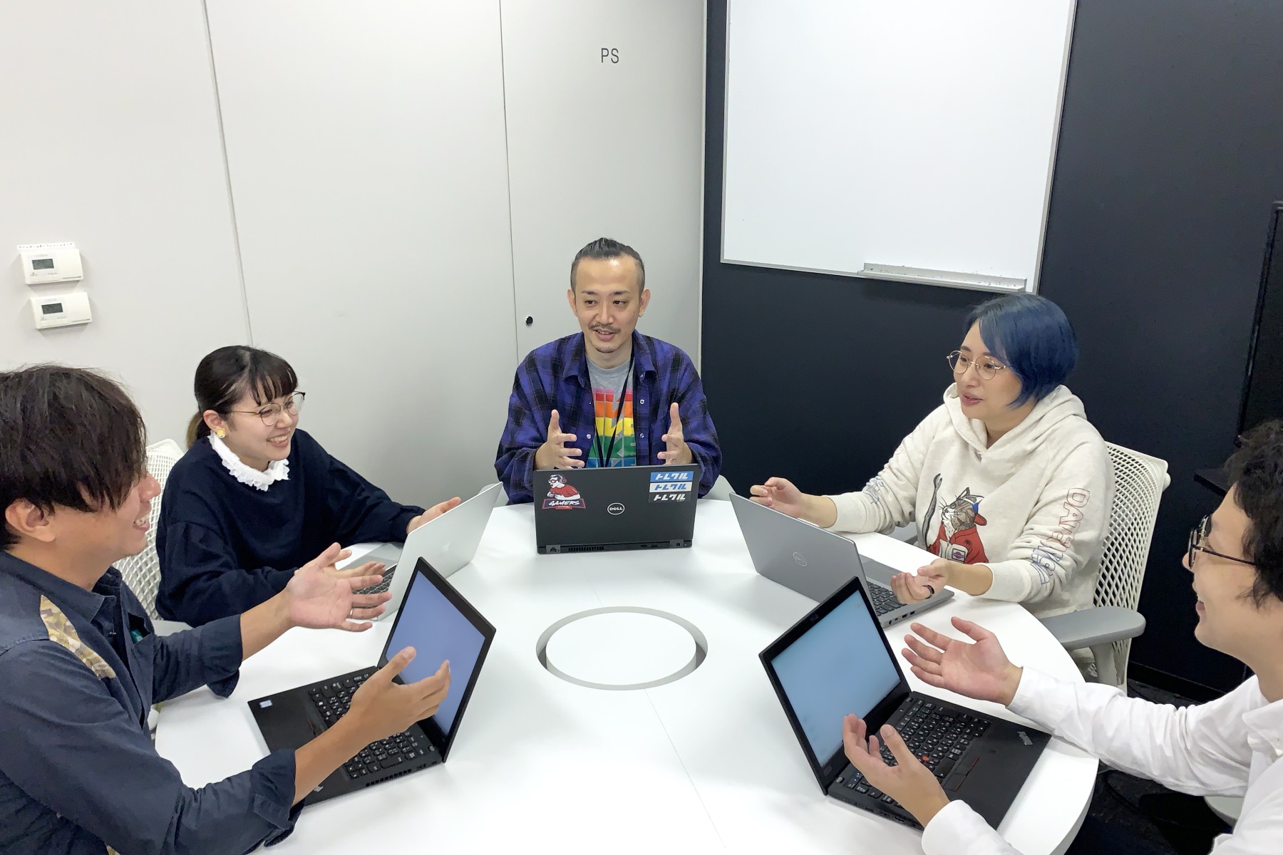 <開発体制について> ・企画職、エンジニア職、デザイナー職含めて20~30名ほどのチームで開発を行っています(※開発フェーズにより、それぞれの職種の人数は変動します) ・チーム内には、職種ごとにPMポジションのメンバーがいることが多いです ・企画の段階からチーム全員でミーティングを行い、一緒に課題を発見し、ディスカッションしています