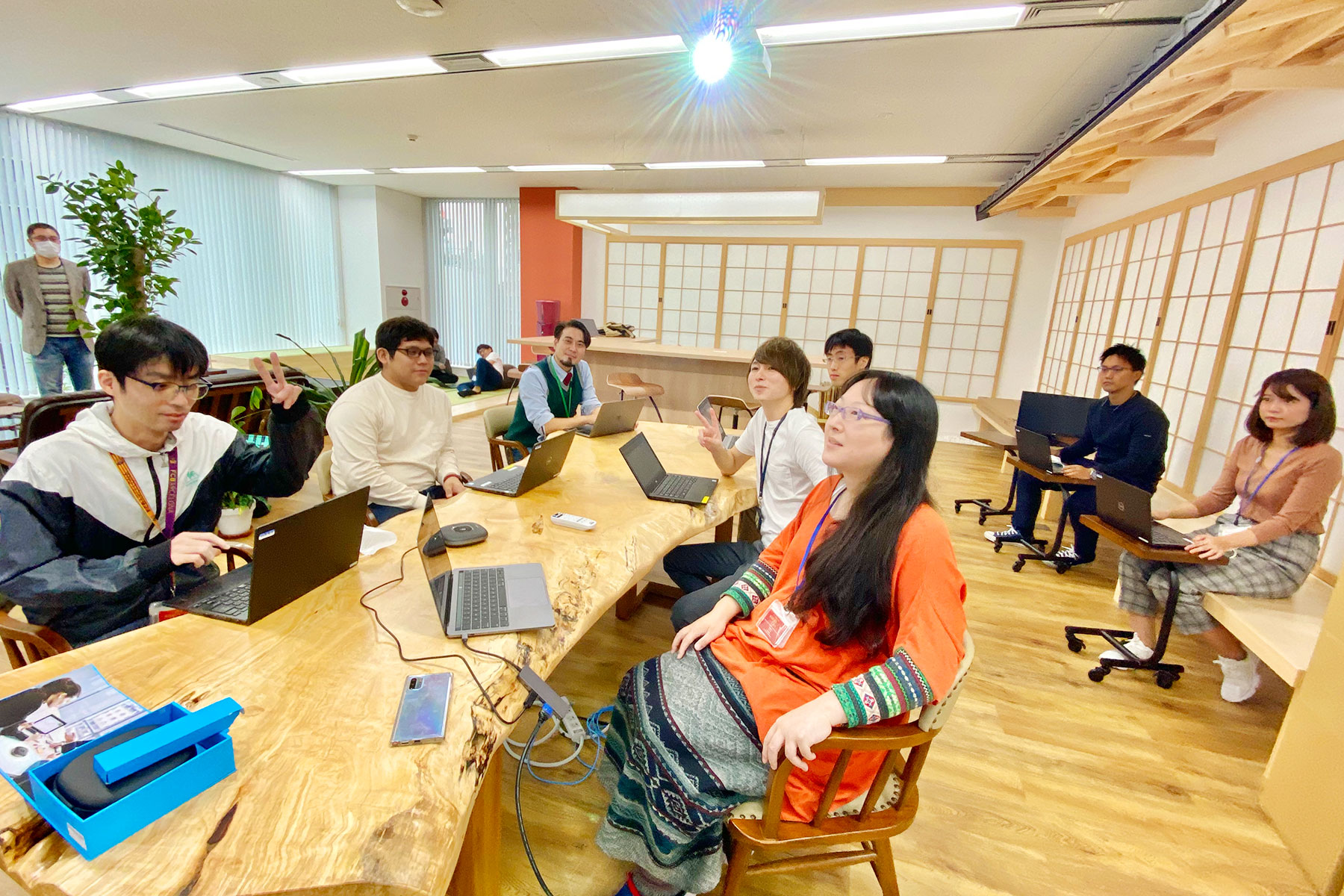 ■ オフィスの特徴 ・和モダンをテーマにしたオフィスには、畳の空間や縁側、大テーブルなどが用意されています ・畳に座って打ち合わせをしたり、ハイチェアーに座ってランチを楽しんだりと、ゆったり過ごせる環境です ・新型コロナウィルスの影響でテレワークが主流となる中、「行くのが楽しみになるオフィス」を目指しています ・オフィスには壁や仕切りなどがなく、全員が見渡せるワンフロア形式ということもあり、エンジニア同士のコミュニケーションも活発です